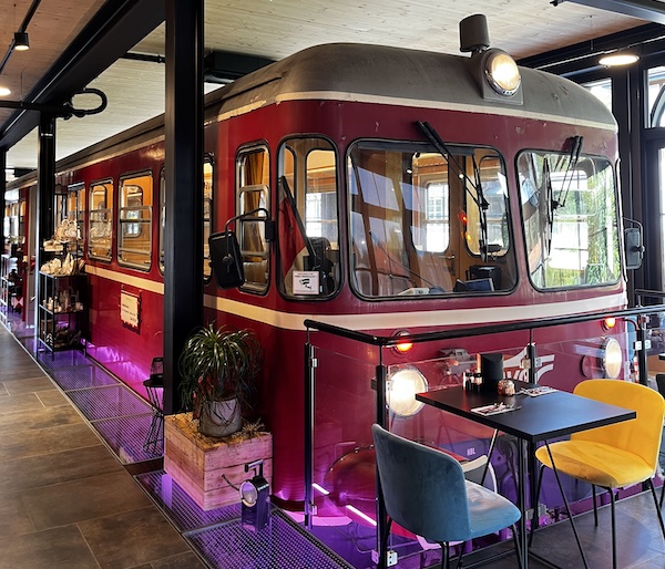 Einzigartig und sehenswert – eine original Esslinger Eisenbahn im Hotelfoyer – ein auf eigenem Gleisbett stehender 25m langer Oldtimer Triebwagen – stilvoll eingerichtet als Hotelrezeption, Bar und Frühstücksraum.